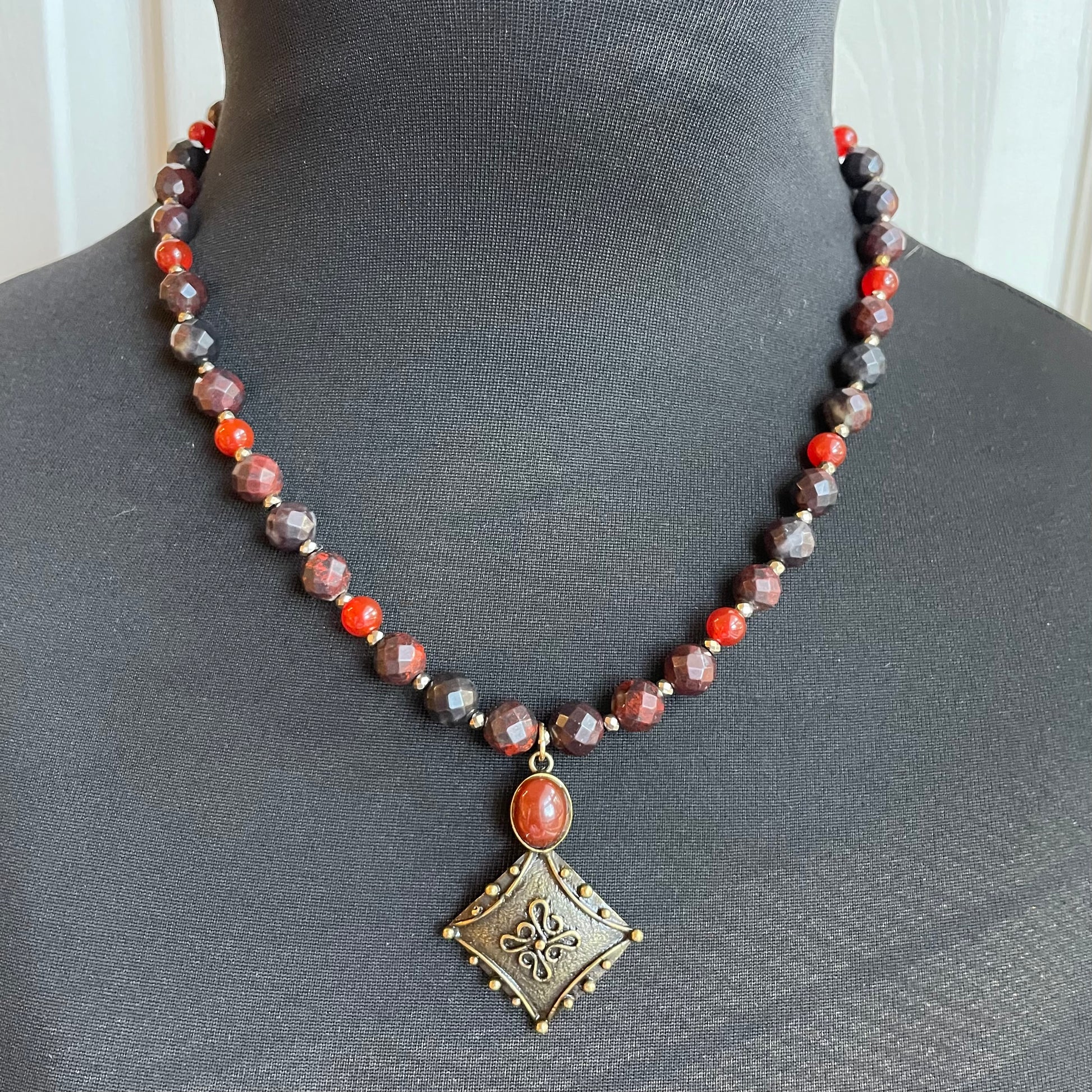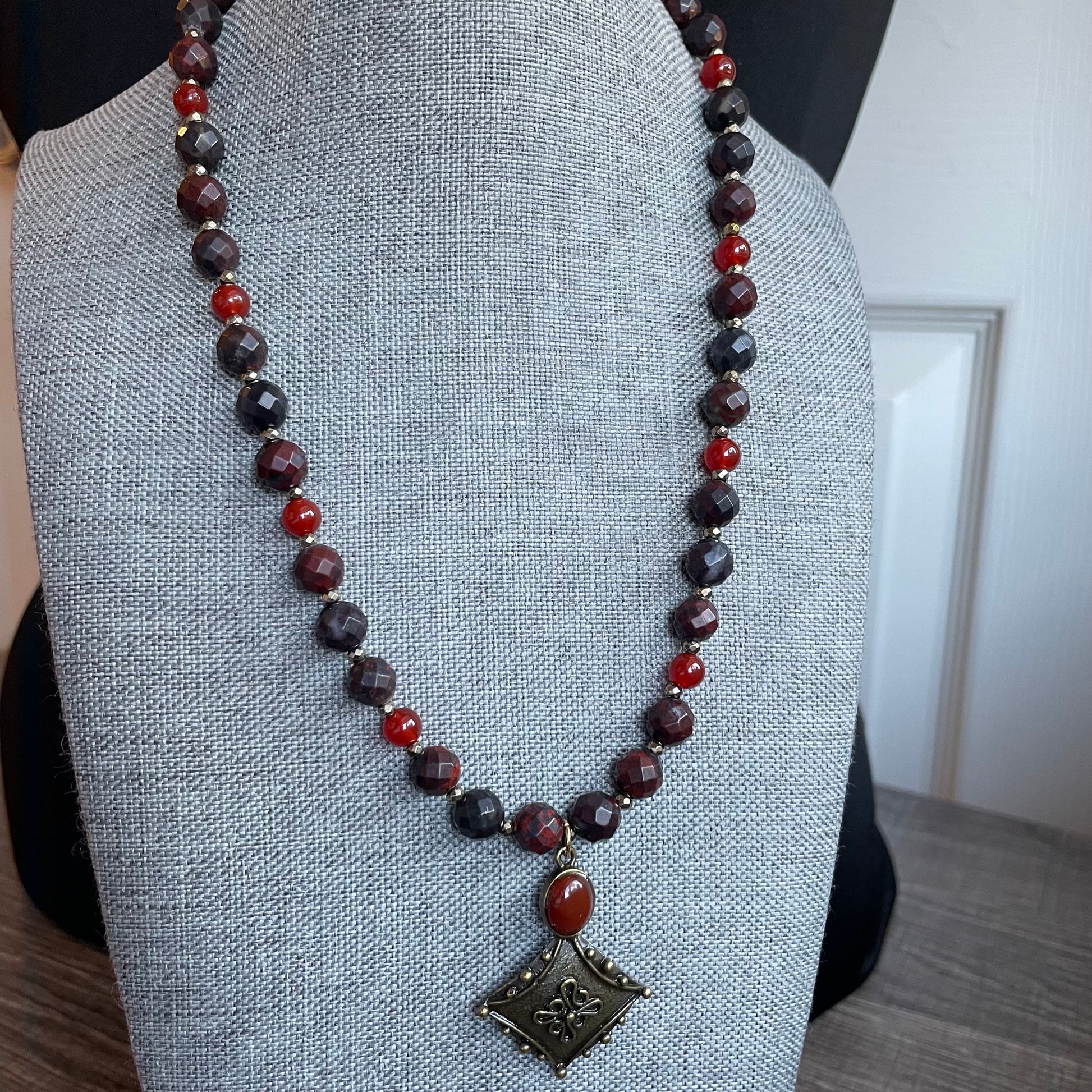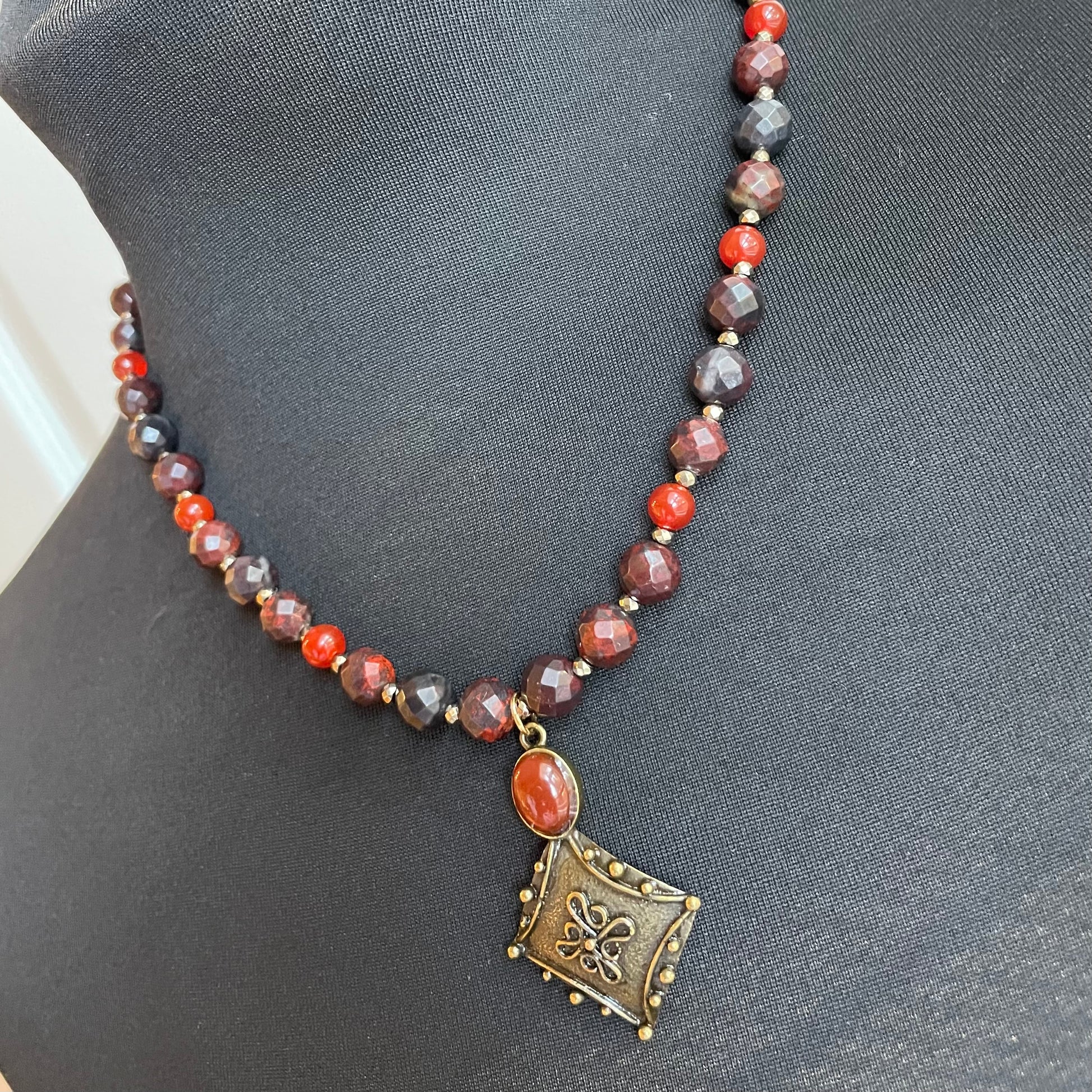 This is an 18 inch necklace piece is beautifully designed with Carnelian and Tigers Iron beads. Tigers iron is Red Jasper, Hematite and Tigers Eye all naturally formed in one. It provides root, sacral and solar plexus healing. It’s great for stamina, vitality, power, strength, emotional support, confidence, sexual vibrancy, positivity, motivation, willpower, good fortune, grounding protection and more. Carnelian is a powerful sacral chakra stone that promotes a positive mood, confidence, drive, passion, creativity and more. The stone in the pendant is Carnelian as well.