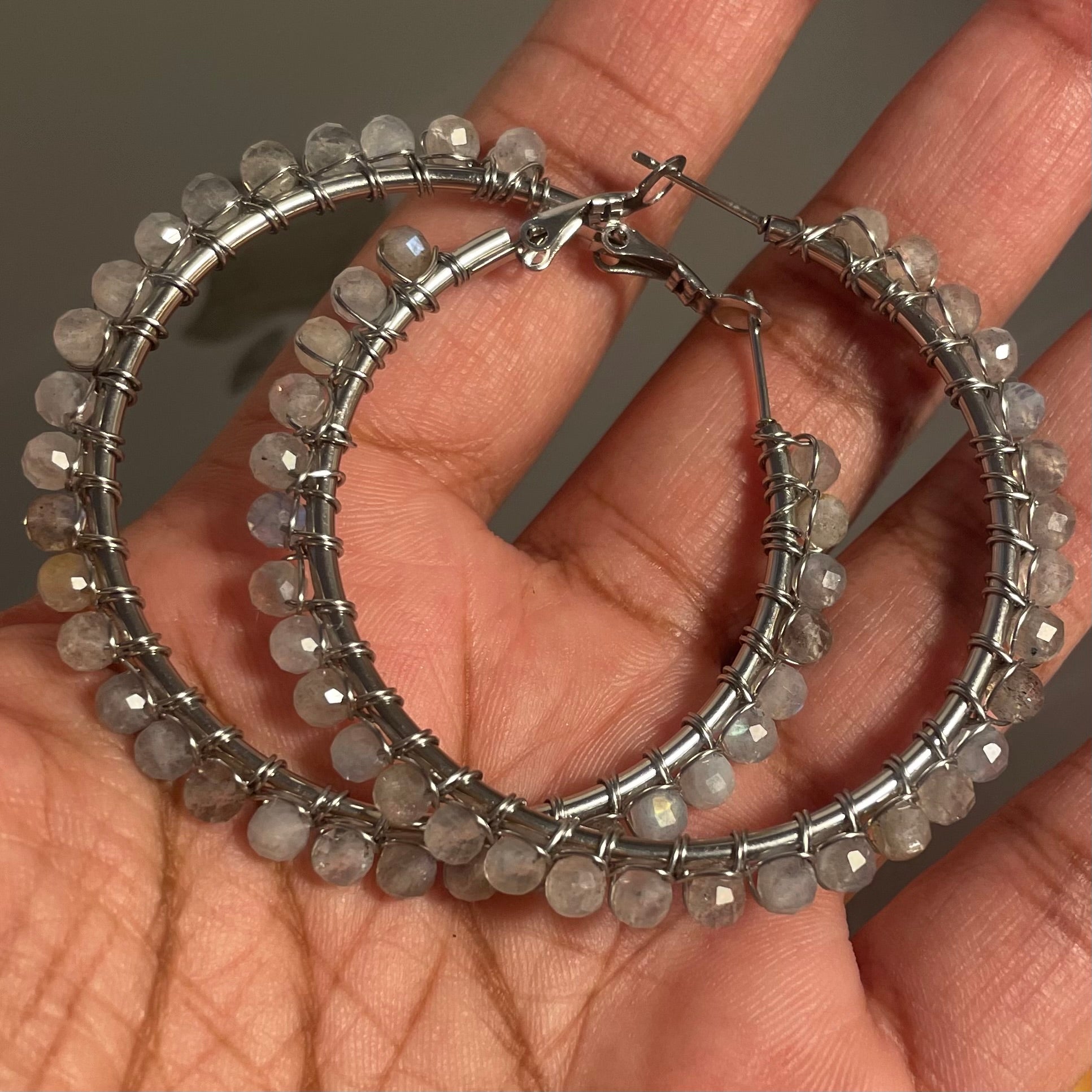 These large Labradorite hand wire wrapped in stainless steel on stainless steel hoops are so gorgeous on! Wearing gemstone earrings really enhance your beauty and aura. Labradorite is for spiritual transformation, letting go and enhancing your intuition/psychic abilities.